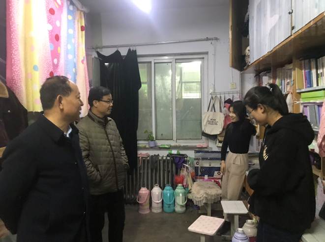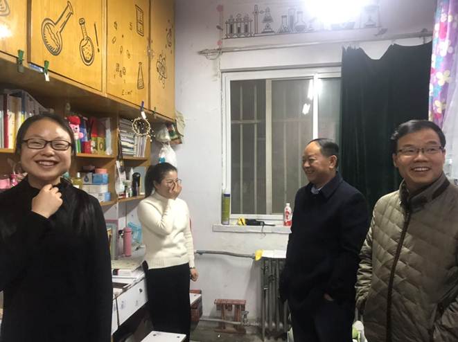 学院领导进入学生宿舍,和学生进行深入交流沟通,询问他们学习、生活上有没有困难需要解决和帮助,了解他们学业、考研复习和上晚自习情况,查看宿舍供暖、卫生状况,嘱咐他们遵守宿舍相关规章制度,提高安全意识,不要违规使用大功率电器,希望他们珍惜缘分、团结互助、和谐共处。