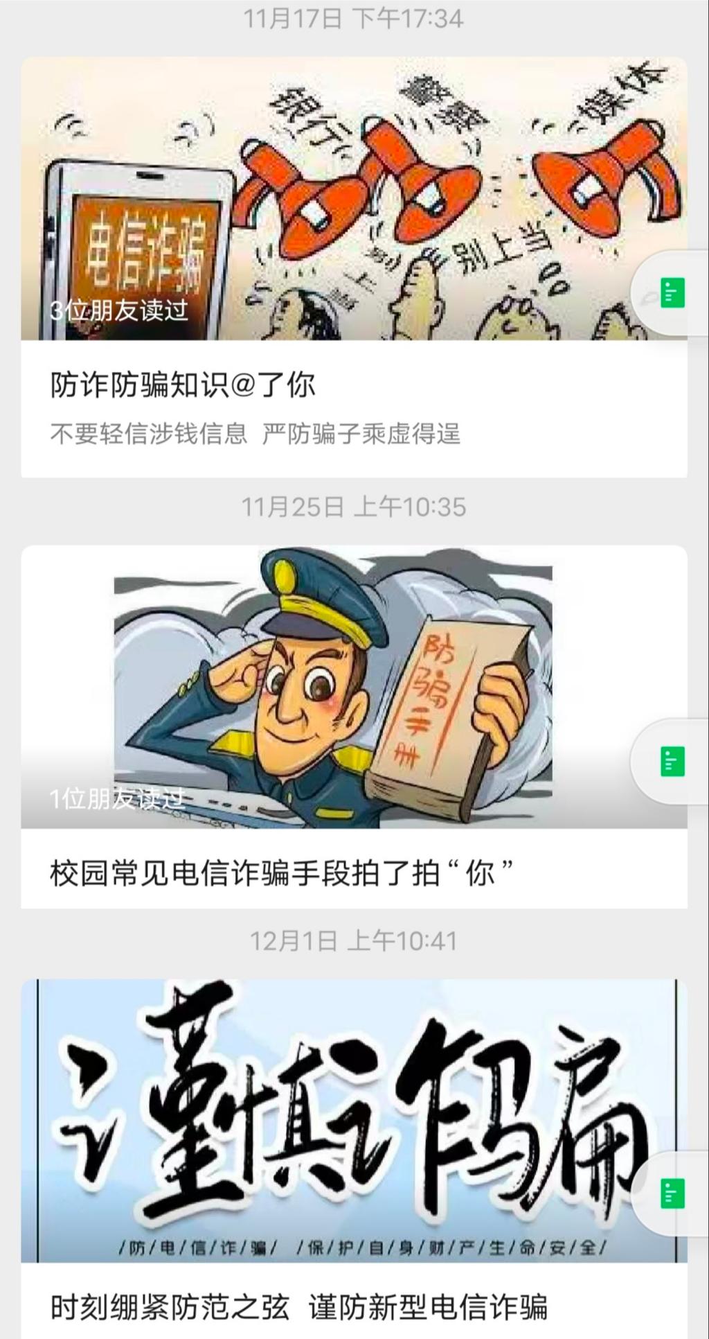 充分发挥网络载体微信公众号宣传作用,1117日至121日在学院微信公众号连续推送了防诈防骗知识@了你校园常见电信诈骗手段拍了拍’”时刻绷紧防范之弦  谨防新型电信诈骗三篇微信推文,使全院师生充分了解校园常见诈骗手段,掌握防诈防骗知识,进一步认清电信诈骗的本质特征,提高识辨电信网络诈骗能力,营造全院师生防骗防诈氛围。