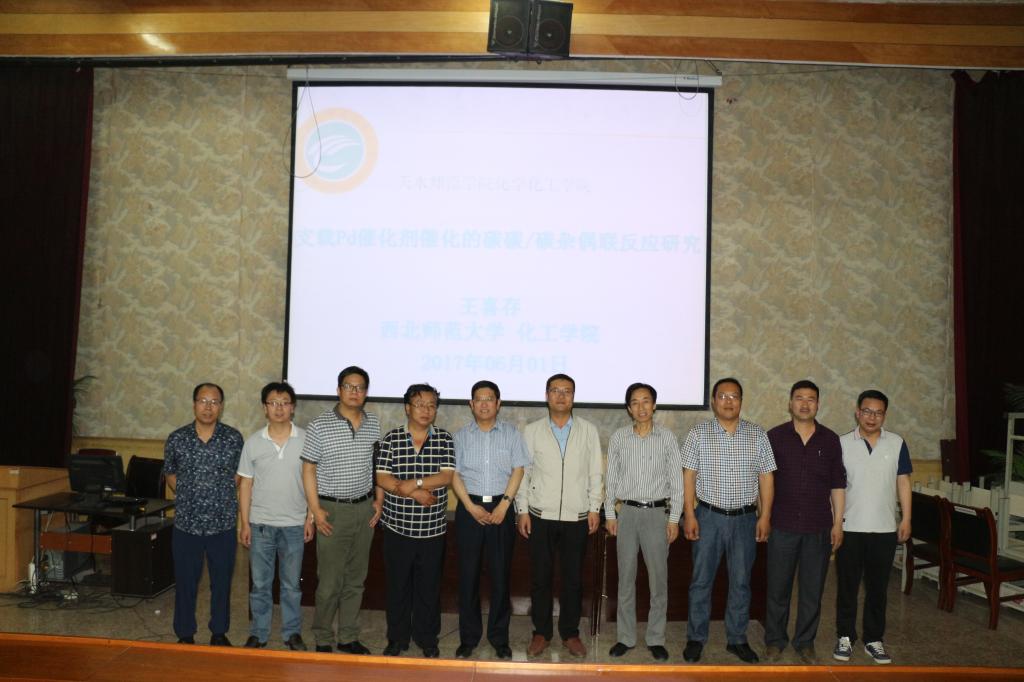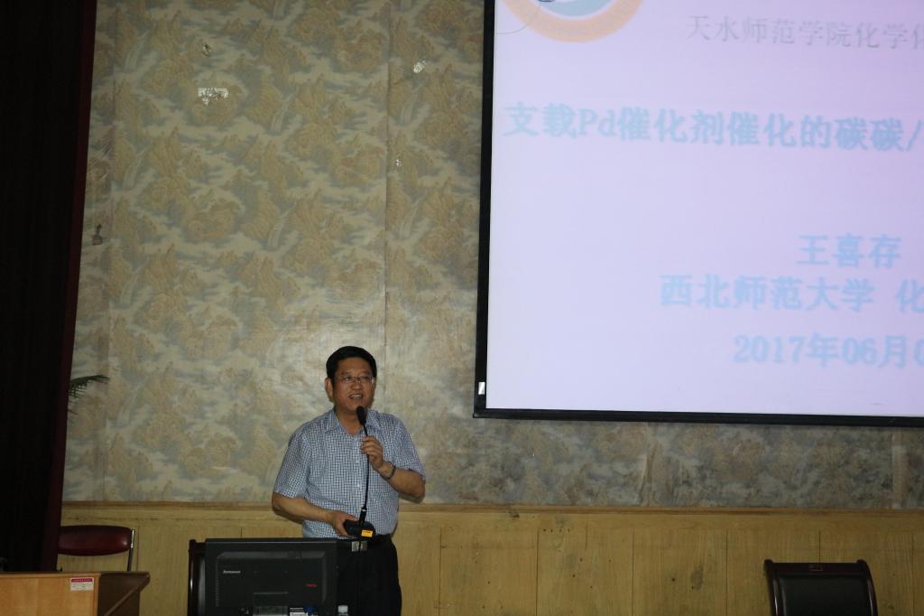 6月1日晚,在1号报告厅,西北师范大学博士生导师王喜存教授,为BEAT365官网师生做了题为“关于支载Pd催化剂催化的碳碳/碳杂偶联反应研究”的学术报告,报告会由BEAT365官网副院长吕玲玲博士主持,研究生处左国防处长、BEAT365官网党总支书记王小芳、院长刘新文,副书记雷新有、副院长杨富巍、吕玲玲及部分教师及学生大约200余人聆听了报告。