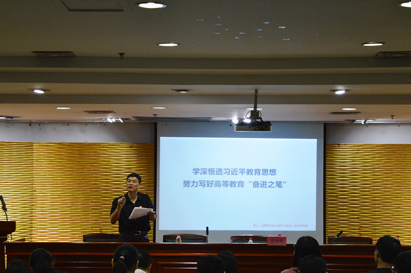 会上,学院党委组织员方水明从指导思想、学习内容、方式与要求、参考资料四个方面介绍了学校关于2018年度教职工政治理论学习的有关安排。随后,学院党委书记潘海鹏以《学深悟透习近平教育思想努力写好高等教育“奋进之笔”》为主题上党课。此次党课也是学院“学习新思想千万师生同上一堂课”活动。潘书记分享了他赴京参加国家教育行政学院第十四期高校中层干部专题研修班的学习心得与感悟,向各位同志讲解了习近平总书记的新时代教育思想,并要求教师党员以身作则,在自己的岗位上落实好立德树人这一根本任务。最后,苏丽辉总结会议精神,大会圆满结束。