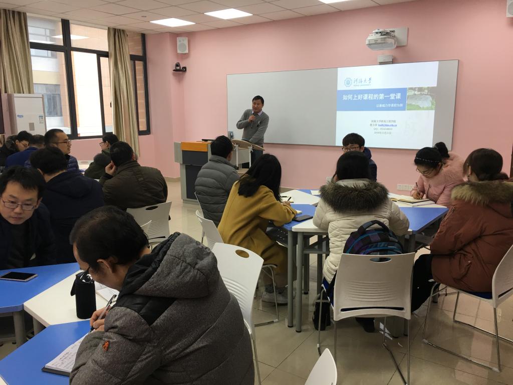 为进一步提高教师的课堂教学能力与业务水平,促进学院教学质量的有效提升,12月21日下午,由校教师教学发展中心主办、365英国上市官方网站教师教学发展分中心承办的“课程教学能力提升计划——如何上好课程第一堂课”在23号楼524-525智慧教室顺利举行。河海大学机电工程学院副院长、江苏省优秀力学教师楼力律老师主讲了此次课程,校教师教学发展中心主任郭江峰、365英国上市官方网站副院长胡明以及学院40多名青年教师参加了本次示范教学活动。