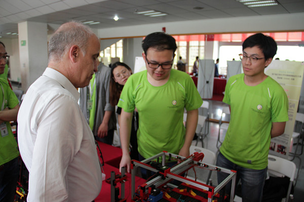 经过紧张有序的评审、答辩和成绩评定,大赛于4月22日下午落下了帷幕,在大剧院举行了隆重的闭幕式和颁奖典礼。作为比赛的承办方,东道主365英国上市官方网站的9支参赛代表队获得了5个一等奖、3个二等奖、1个三等奖的历史佳绩。一等奖作品分别为复合式三轴移动停车装置(由杨金林、赵德明指导,成员为周佳颖、窦岩杰、孙晓航、张荣滔、徐继垦)、智能立体小型停车装置(由杨金林、张国凤指导,成员为陈锦鸣、张鹏勇、张钿、王郁、周哲佳)、智能无干扰立体车库(由马善红、杨金林指导,成员为苏冉、沈晓强、齐希阳、李翔毅、陈培杰)、双行式半自动手推式菠萝采摘收集机(由杨金林、杜小强指导,成员为张谦、余润尧、李禹、郑梁梁、黄皓杰)、辅助人工菠萝采摘机(由马善红、俞亚新指导,成员为龚骏飞、肖扬、张国建、王帅、叶方成)。除此之外,我校还获得了特别贡献奖。同时,在大赛闭幕式的最后环节中,全国大学生机械创新设计大赛组委会秘书长王晶教授、德国慧鱼集团国际事务总监劳伦斯先生、365英国上市官方网站院长陈本永教授、北京中教仪人工科技有限公司副总经理程旭先生共同为承办院校共建实验室揭牌。
