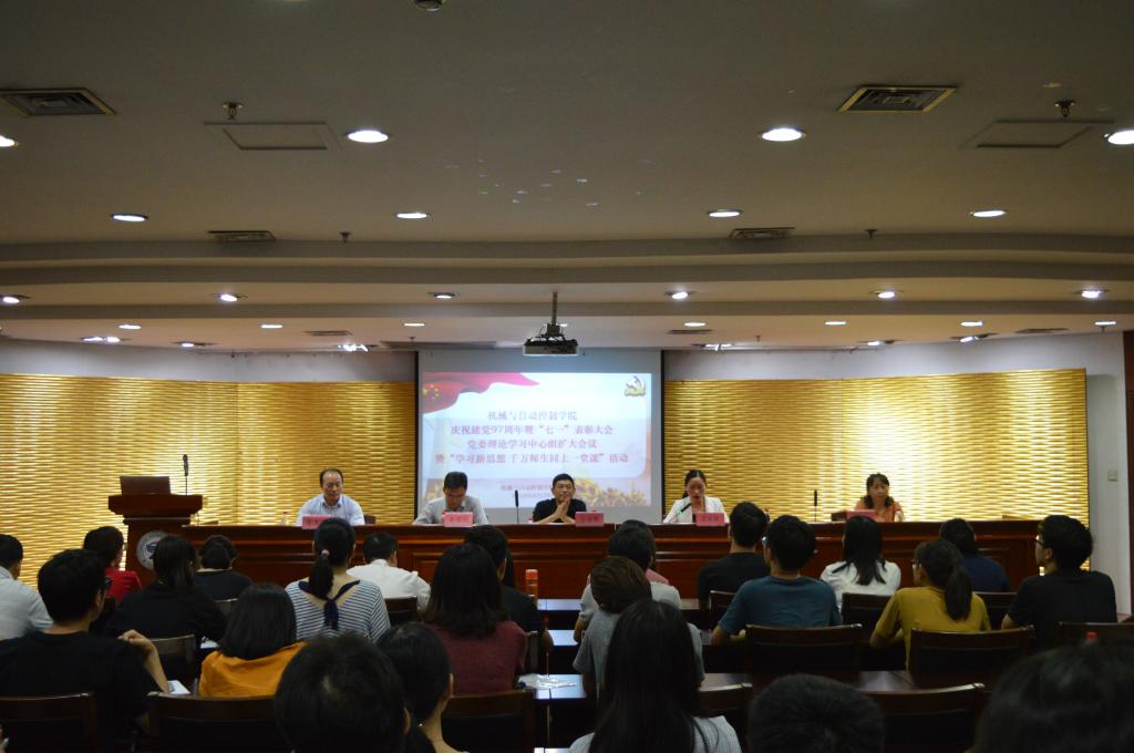 本次大会的主要内容为庆祝中国共产党成立97周年暨“七一”表彰大会,学院党委理论学习中心组扩大会议暨“学习新思想千万师生同上一堂课”活动,共七个议程。大会开始,全体起立,奏唱国歌。潘海鹏书记带领全体党员同志重温入党誓词。俞高红同志宣读学院优秀党支部、优秀共产党员和优秀支部书记名单,学院领导为各获奖支部与党员颁发荣誉证书。随后,优秀党员代表上台发言。机械工程实验教学中心党支部的优秀教工党员马善红结合自身工作,讲述教工党员如何为人师表、积极奉献;控制工程研究生党支部书记赵梦恩分享了自己研究生阶段的支教与工作经历,并呼吁全体党员勿忘初心。之后,学院学工办主任方水明对我校2018年度教职工政治理论学习的有关安排进行解读。最后一项议程是“学习新思想 千万师生同上一堂课”活动,由学院党委书记上主题党课。潘书记以《学深悟透习近平教育思想努力写好高等教育“奋进之笔”》为主题,向各位同志讲解了新时代高等教育的主要任务与要求,分享个人学习心得与感悟,并鼓励教师党员以身作则,落实好立德树人这一根本任务。这生动的一课也为党员教师们明确了目标、理顺了思路、振奋了精神。最后,会议在阵阵掌声中完满结束。