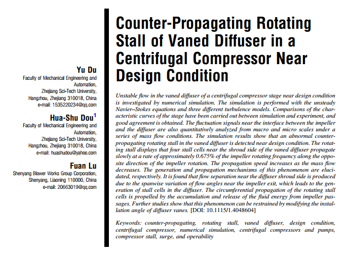 近期,365英国官网硕士研究生杜昱同学以第一作者身份在国际著名期刊《ASME Journal of Turbomachinery》发表长达19页(双栏)的研究论文,论文题目Counter-Propagating Rotating Stall of Vaned Diffuser in a Centrifugal Compressor Near Design Condition(离心压缩机近设计工况叶片扩压器的反向传播旋转失速),通讯作者为导师窦华书教授。