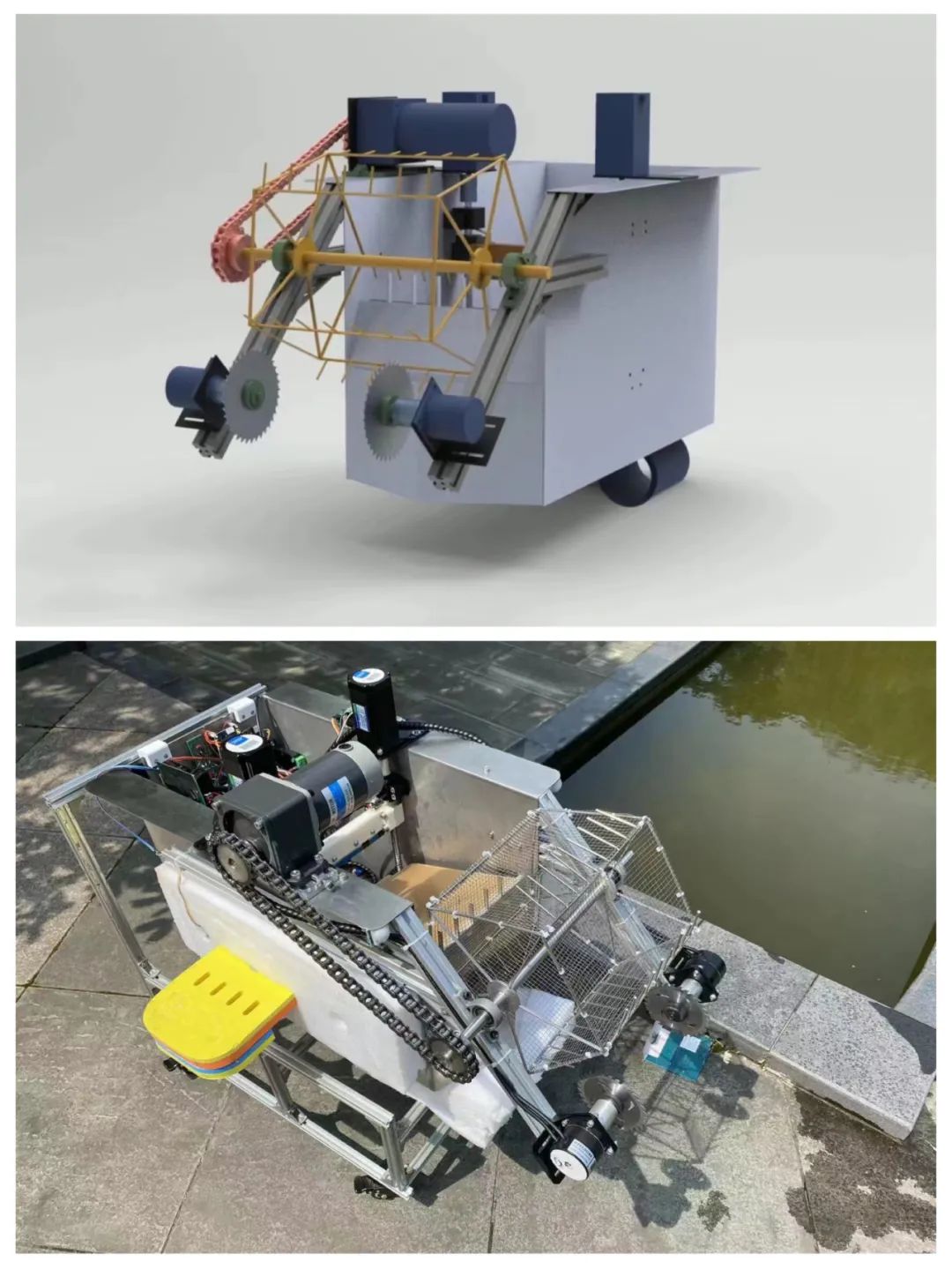 作品简介:本项目针对市场空缺,设计了一个可以由单人搬运、操作的小型漂浮植物打捞机。在船体运动方面遥控控制推进器以实现水中各方向运动;在打捞存储方面,由于漂浮植物根部大片缠绕的特性,前端两侧设置圆锯片切割;采用链传动驱动拨禾轮结构打捞,并设置耙状定叉的形式将漂浮植物剥离入仓体;采用水位检测器来判断满载;运用丝杆传动割刀,切断正在被打捞的相连的漂浮植物;船体前端设置人体传感器与摄像头以保证圆锯片的使用安全。