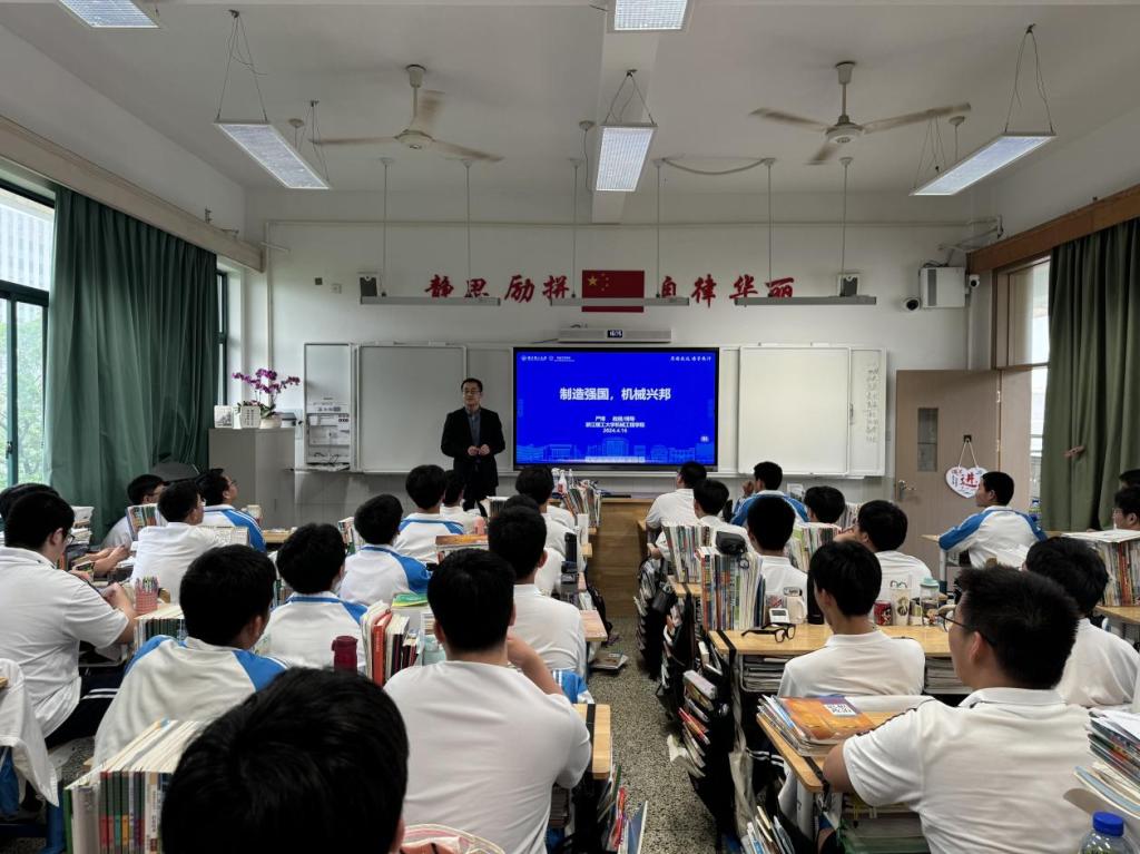学科品牌进中学,学术思维进头脑,为进一步加强双高衔接,促进与优质生源学校的交流与合作,携手为高中学子保驾护航,4月16日,365英国官网学术副院长严博教授应邀前往杭州市源清中学参加“浙理学科进中学”活动,并面向高二学生作题为《制造强国,机械兴邦》专业知识科普课程。