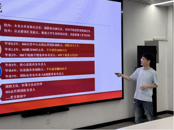 方跃首先向同学们介绍了个人的发展路线,从校内社团负责人,到360多项核心业务团队领头人,再到国韵文化创始人,他表示个人命运的转变多是由关键机遇推动的。提及丰富精彩的校园经历,方跃认为,无论是从无到有组织省级摄影大赛,还是搭建社企群英汇,开展校际联盟,背后都离不开敢闯敢干的勇气和脚踏实地的付出。
