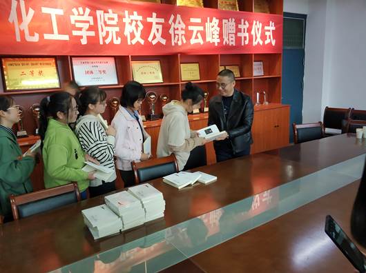 徐云峰向BEAT365官网师生和学校图书馆捐赠自己近两年出版的散文随笔集《云在天上飞》和《心路一光年》共1000余册。