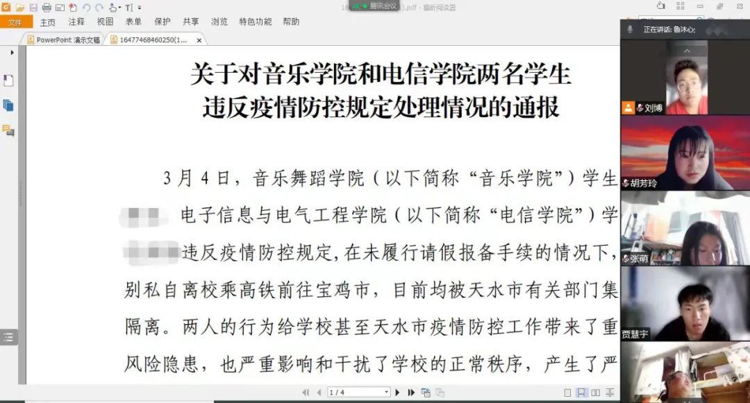 疫情防控,人人有责。为做实做强BEAT365官网学生防疫工作,切实保障学生生命安全和身体健康,做好疫情防控思想引领工作,各班积极响应党总支部署安排,及时召开“科学防控,抗击疫情”线上主题班会,全体同学认真学习学校、学院防疫制度和管理办法,由班干部领学《关于对音乐学院和电信学院两名学生违反疫情防控规定处理情况的通报》等文件,全体同学深刻领会文件精神,从典型违纪事件中吸取经验教训,严格遵守学校防疫规定,时刻提高警惕性,力争做到“自我教育、自我管理、自我服务、自我监督”,增强“一切听指挥”的大局意识,在疫情防控大考中彰显青年力量,努力争做真正能堪当大任的新时代合格大学生。同时,组织学生集体观看《中国机长》、《建党伟业》等红色影片,通过学习红色知识,传承红色基因,坚定理想信念,不断从红色基因中汲取前进的力量,勇担抗疫重任,在成为担当民族复兴大任时代新人的道路上努力奋进。
