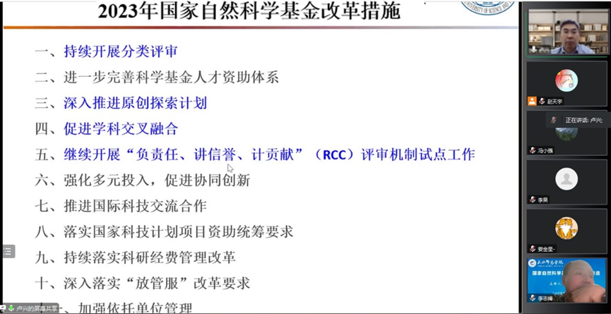 卢教授长期担任国家自然科学基金评审专家,他结合自己多年国家自然科学基金申请和评审的经历,以“基金申请——得之我幸”为题介绍了国家自然科学基金历年申报情况和2023年度国家自然科学基金十一项改革措施,详细阐述了国家自然科学基金申请中科学问题属性与科学评价说明的含义、基金资助政策、申请条件与评审流程,并结合实例重点对国家自然科学基金申请书的10个重要板块内容进行多角度全方位地解读和撰写指导。在提问环节中,卢教授对学院教师在申请书撰写中所遇到的困难和疑问作了耐心、深入的解答。卢教授鼓励各位教师要注重研究的创新性和延续性,拓宽科研工作思路,潜心投入学术研究。