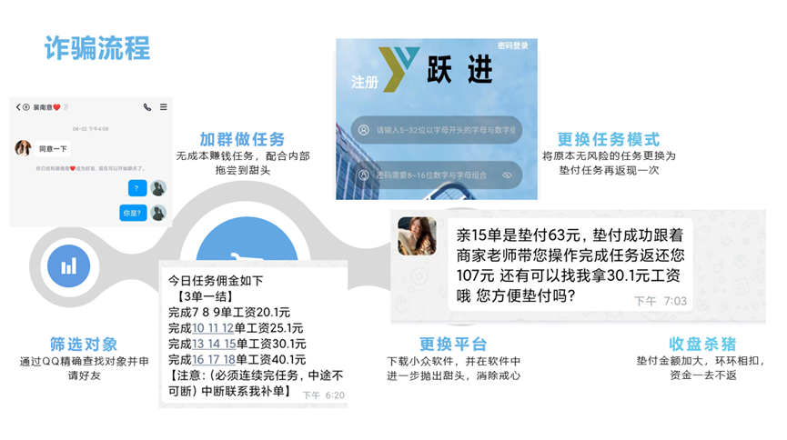 2023年4月3日,机电研究生第四党支部钱琛同志收到“兼职刷单”的好友申请,通过后对方将钱琛拉进内部群,群内有人发布一些无成本的简单任务,如关注一些公众号。在一轮任务过后,对方改变任务模式,要求垫付保证金并提供银行卡信息。钱琛认识到这可能是诈骗行为后与支部书记及时进行了对接,为了进一步揭露诈骗团伙的作案手法,钱琛在支委的关注下假意继续配合对方……期间钱琛同志一直保持警惕,反复核实对方的信息,在确认这是一起网络诈骗案件后及时向警方报案。
