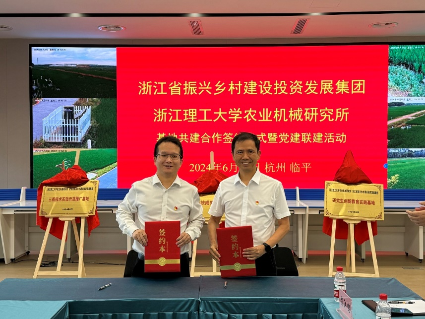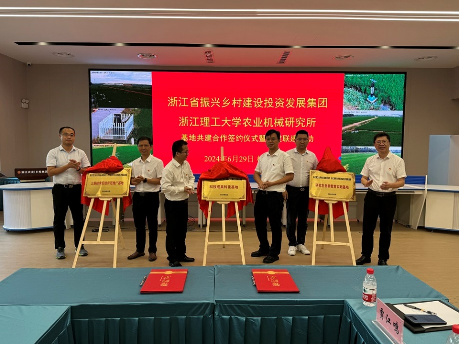 随后举行了365英国上市官方网站农业机械研究所、浙江省振兴乡村建设投资发展集团科技成果转化基地、三新技术实验示范推广基地、研究生创新教育实践基地的揭牌仪式。双方代表郑重签订科技成果转化基地、三新技术实验示范推广基地、研究生创新教育实践基地共建协议,并为基地揭牌。